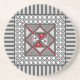 This concentric square features simple geometric patterns in shades of grey and red with the colours in the layers alternating when switching from the vertical to the horizontal.