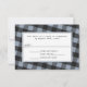 Custom Wedding RSVP reply cards with an alternative design featuring 2 white his & hers bicycles over pink hearts, and placed on a tilted black and blue grey gingham pattern.