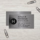 Custom professional business card, with graphics of a brushed aluminum look. Gradient black dots, on the left front of the card ends in a large black circle with a grey single letter monogram. Personalize all the text fields for your business needs.