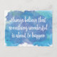 Always believe that something wonderful is about to happen favourite saying inspirational quote with a positive message and a blue watercolor splash background.