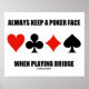 Bridge clubs and bridge teachers, along with avid bridge players, will enjoy this poster featuring the four card suits along with the following sound bridge advice whenever one plays the game of bridge: "Always Keep A Poker Face When Playing Bridge".