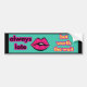 This cute bumper sticker is made especially for the fashionably late! In a bold black font outlined in pink, the bumper sticker proclaims "always late" followed by "but worth the wait" in bright yellow text. In between the two phrases sits an illustration of lips to add an extra sassy touch. Order yours today for that one friend that always seems to show up a few minutes late!