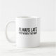 Start your day with a smile using this playful coffee mug that says “Always Late But Worth The Wait.” Perfect for anyone who runs on their own schedule, this mug makes a fun gift for friends, coworkers, or anyone with a sense of humour about their tardiness. Great for home, office, or as a lighthearted present, it’s sure to bring laughs with every sip.