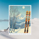 Hello from the snowy mountains of Alyeska Resort, Alaska, USA! We hope you're having a wonderful ski vacation. This postcard features a gorgeous blue-grey mountain landscape with retro ski boards in an orange tribal pattern.