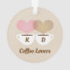 Un joli ornement de Noël personnalisé pour les "amateurs de café". Comprend deux tasses à café avec une vapeur en forme de coeur brun et rose clair entrelacée et un arrière - plan couleur crème. Personnalisez le texte personnalisé avec les initiales du prénom du couple. La conception recto verso comprend la même image et le même texte de chaque côté.