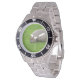 Has heft and feel of expensive stainless steel quartz watches. Good band with safety catch. I removed links, which is easy because engraved arrows show direction to push the linking pins. As always by this seller, the image (a railroad logo) is a perfect reproduction of my emailed image, and is precisely spaced and aligned.
