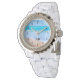 A monogrammed watch with a photograph of a clear blue ocean scene with gentle waves along a seashore and soft brown sand. A blue sky with fluffy clouds off in the distance. Serene tropical idyllic seascape.