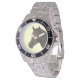 Has heft and feel of expensive stainless steel quartz watches. Good band with safety catch. I removed links, which is easy because engraved arrows show direction to push the linking pins. As always by this seller, the image (a railroad logo) is a perfect reproduction of my emailed image, and is precisely spaced and aligned.
