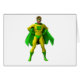 Illustration of an amazing superhero dressed in yellow and green costume with cape standing with hands on hip
