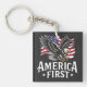 America First : design featuring a fierce bald eagle in flight, clutching claws ready, set against a distressed American flag backdrop.