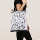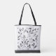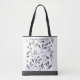 This tote bag is shown with a fresh leaf print in black and grey tones. On front top is an American iconic pageant crown in black.