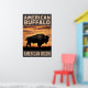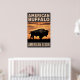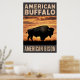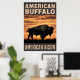 A silhouette of an American bison standing in a field against a vibrant sunset sky.