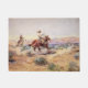 This design features a painting by the American artist Charles M. Russell (1864–1926). It shows two cowboys on horseback as they chase after a wild wolf and catch it with a rope lasso around its neck. The wolf had perhaps attacked some of their cattle livestock. The landscape is atmospheric with small patches of grass growing from the sand on the ground and dusty mesas rising in the background. One of the cowboys is riding a brown horse, while the other is riding a white horse. The wolf has grey fur and its legs are up in the air since it's been captured by the cowboy's lasso. The original art was painted in 1918.