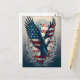 A Bald Eagle with its wings spread wide, its feathers patterned in the colours of the American flag, soars through the sky.