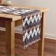 The American Echo Table Runner blends bold geometric design with the layered rhythm of traditional patterns. Deep tones of crimson, navy blue, and white move across the fabric in repeating triangular forms, crossed lines, and small circular accents that feel like visual percussion across the surface. The pattern creates a steady cadence that runs the length of the table, giving the space a sense of movement and balance.