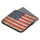 A graphic design of an aged American Stars and Stripes flag in typical red, white and blue