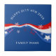 An abstract American flag with stars and stripes in red white and blue. Happy July 4th custom text and family name. Modern patriotic design.