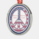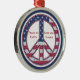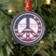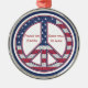 This retro ornament has a red, white and blue American flag peace sign on the front and the reverse side. The front says "Peace on Earth" and "Good Will To Man" and the back says "Christmas" and the year.