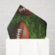 A repeating pattern of brown, textured American footballs with white laces is displayed on a background of green, textured grass. The footballs are evenly distributed and oriented in various directions, creating a continuous and seamless design. The pattern is visually consistent, with each football and blade of grass rendered in detail. Perfect for sports enthusiasts.