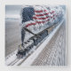 An old steam locomotive travels through a snowy Midwest barren farmland with steam forming the design of the American flag above it.