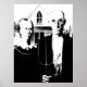 A black and white pop art style print of the iconic painting "American Gothic" by Grant Wood.
