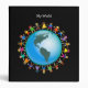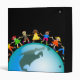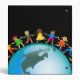 Cute cartoon illustration of a group of happy and diverse boys and girls holding hands around a globe with a map of North and South America. Image available on various gifts and products. Customize if you prefer and change the background colour or add some text.