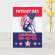 Poster greeting card illustration of a patriot minuteman revolutionary soldier holding an American stars and stripes flag and words patriot day remember september 11, 2001.