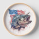 This stylish and patriotic fisherman's clock is the perfect way to show your love for fishing and America. The clock features an image of a fish jumping out of the water in front of an American flag.