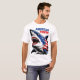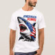 Cette image présente un requin féroce avec sa bouche large ouverte, avec des dents pointues. Le corps du requin est orné d'éléments du drapeau américain, dont des étoiles et des rayures rouges et blanches. Au-dessus du requin, les mots "AMERICAN POWER" sont écrits en caractères gras bleus et rouges. Cette conception apparaît sur un t-shirt blanc.