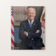 The photograph captures a moment in time before president elect Joe Biden appointed office of Vice President of the United States. Sunlight streams through a window, casting a warm glow on the figure of an Biden standing confidently in the center of the frame. His arms are crossed, a gesture that suggests both authority and a hint of casual ease. --- Mr. Biden is dressed impeccably in a dark suit, the crisp fabric contrasting sharply with the clean lines of his white shirt. A blue and white striped tie adds a touch of personality to the ensemble. --- A glimpse of patriotism is evident in the background. An American flag stands proudly on a pole to the man's right, its vibrant colors a subtle counterpoint to the cool blue of the wall behind him. A closer look reveals a painting hanging on the wall, adding a touch of personal flair to the professional atmosphere. --- Soon to be Vice President Biden is the focal point of the image. His short white hair frames a kind face, etched with the lines of a life well-lived. A warm smile plays on his lips, conveying a sense of confidence, wisdom, and perhaps a hint of amusement.