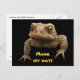 A grumpy looking American Toad (Bufo americanus) is looking out at you from the front of this postcard. This small amphibian is brown with black, gold olive green and orange coloration. His warts distinguish him from his frog neighbours. Although hatched in the water of ponds, rivers, lakes or streams, the tadpoles soon move to land where the toads live their adult lives. His startling call is a long screech. He looks quite fierce but is actually a gentle little guy who eat lots of garden pests including insects and slugs. The text reads: Make my day ! It can be customized or removed.