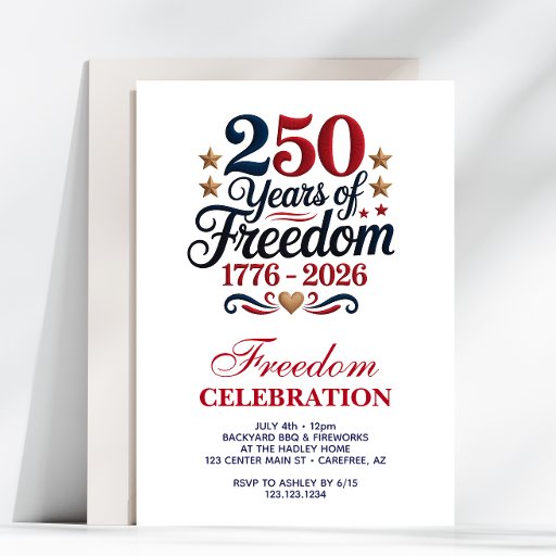 Create your own America's 250th Birthday Party Invitation! Personalize this design with your own text. You can further customize this design by selecting the "Edit Details" button if desired.