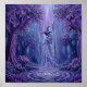 This surreal poster features an enchanted forest unfolds in a palette of deep violet, lavender, and midnight blue, creating an atmosphere that feels both luxurious and otherworldly. Towering trees frame the scene like elegant guardians, their twisting trunks and dense canopies forming a natural corridor that draws the eye toward the luminous center. In the heart of the composition, a mysterious floating figure rises with effortless grace, cloaked in flowing robes and crowned by a pointed hat, evoking the allure of magic, transformation, and untamed imagination. The entire image shimmers with a dreamlike texture, as if painted in layers of light and shadow. Cascading vertical streaks in the background suggest falling rain, ethereal energy, or a hidden waterfall of color, adding motion and depth to the scene. Below, concentric ripples spread across a reflective pool, anchoring the fantasy in a hypnotic focal point and reinforcing the sense of calm, power, and ritual. This is a world that feels premium, mystical, and immersive-an evocative visual built to captivate attention instantly. It suggests discovery, elegance, and a touch of the supernatural, making it ideal for a campaign that wants to feel bold, cinematic, and unforgettable. Finished in a layered oil acrylic painterly style.