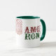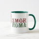 lovely detail of green vintage royal lace with words text 'amor roma' two words that mirror each other, 'amor' and 'roma' amor is in dark red, and roma is in dark green colors, in an ornate and decorative text or font style, and above it is a section of decorative floral green lace with flowers and leaves, an antique fabric