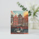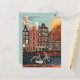 An illustration of Amsterdam the capital city of The Netherlands features charming, colourful houses along a canal, a white bicycle in the foreground, and autumn trees under a blue sky with birds flying.