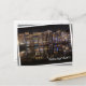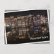 Postcard of traditional architecture canal houses with colourful lights and reflection in the water at night in the Red Light District in the city centre of Amsterdam, the Netherlands with a white edge and in white the text 'Amsterdam'. The photo is a bit rotated to create the illusion of it laying loose.