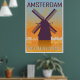 Amsterdam vintage poster in orange and blue textured background with skyiline in white