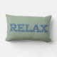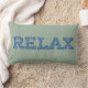 Un coussin lombaire amusant avec le mot "CHILL" en lettres remplies d'un motif bleu et blanc sur un arrière - plan vert tendre.