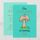 Amusant Guy Man ou Boy Birthday Party Invitations, pour n'importe quel âge, présentent un mignon champignon de dessin animé contre un arrière - plan turquoise avec du texte noir et or sur le devant avec le nom de l'honoré, et sur le dos, la date, l'heure, le lieu et RSVP. Parfait pour tout homme : mari, père, fils, frère, grand-père, oncle, patron, collègue ou voisin. L'information sur le dos est en couleur or lettrage contre une nuance plus claire d'arrière - plan turquoise. Modifiez facilement la police ou la couleur que vous désirez.