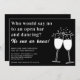 Vous êtes décontracté ou informel ? Utilisez ce drôle de faire-part de mariage noir et blanc avec Qui dirait non à un open bar et danser? Personne Que Nous Connaissons ! Ajoutez les noms, l'emplacement et vos coordonnées aux invitations pour vous aider à célébrer votre journée spéciale.