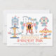 This cute kid's birthday invitation features a a white background with a Carousel, Ferris Wheel, Roller Coaster, Self-control Plane, Castle, and Carnival Cart. The reverse side features a white background with red chevron patterns. Personalize for your needs. You can find more matching products at my store.