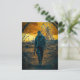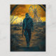 A lone figure wearing a gas mask walks towards the viewer, set against the backdrop of an abandoned amusement park with a prominent Ferris wheel under a dramatic orange sky. Barbed wire frames the scene, enhancing the post-apocalyptic atmosphere.