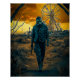 A lone figure wearing a gas mask walks towards the viewer, set against the backdrop of an abandoned amusement park with a prominent Ferris wheel under a dramatic orange sky. Barbed wire frames the scene, enhancing the post-apocalyptic atmosphere.