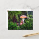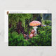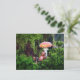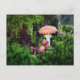 An acorn elf is resting under a mushroom postcard