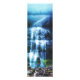 A foggy landscape painting of a waterfall cascading off the side of a mountain, and into a rocky river.