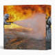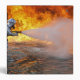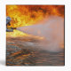 An aircraft rescue firefighting team attempts to spray out a fuel fire