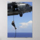 An explosive ordnance disposal technician fast ropes onto the flight deck of the USS Ronald Reagan
