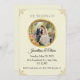 An invitation card for a wedding entitled “Romantic Moments” depicting two newlyweds sitting on a bench exchanging romantic glances