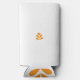The design features a simple graphic of three orange, abstract shapes arranged in a pattern that resembles a stylized flame or plant. Here’s a detailed description: