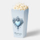 An ornate light blue archway with floral accents, favor box